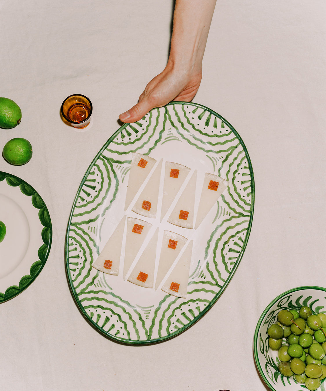 People do like food to soak up the drinks, but you don’t have to provide a huge sit-down meal. Leave platters of canapés and chic little bowls of food around for people to help themselves. Some of our favourite (budget-conscious) options are Spanish-inspired, including slices of manchego with membrillo on top, gildas, posh crisps with jamon on top. Pinxtos-style things on little pieces of bread is another great one, and little coupes of olives dotted around is chic and easy.