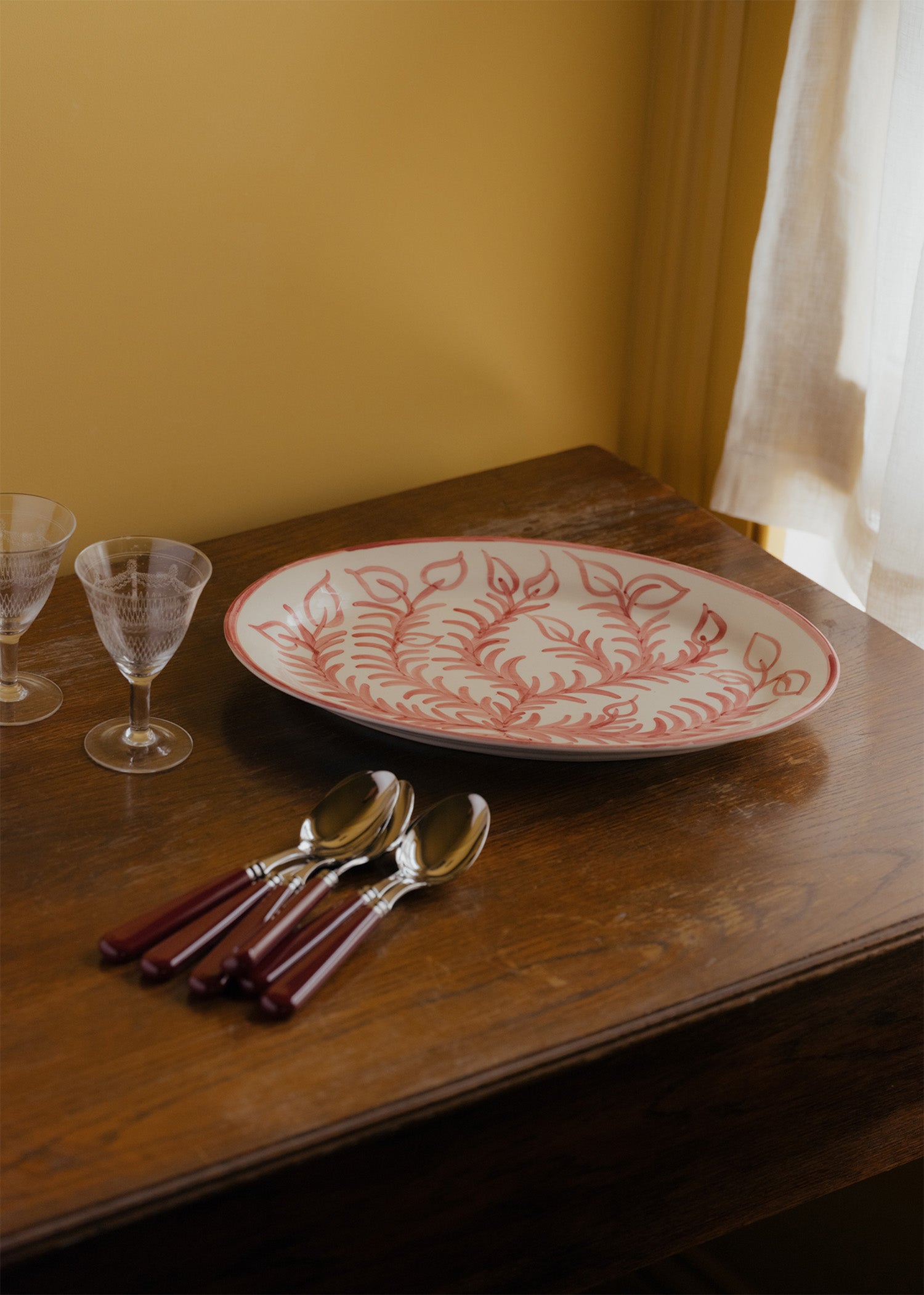 Hand-painted large oval serving platter, in the pink leaves Vina design.