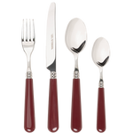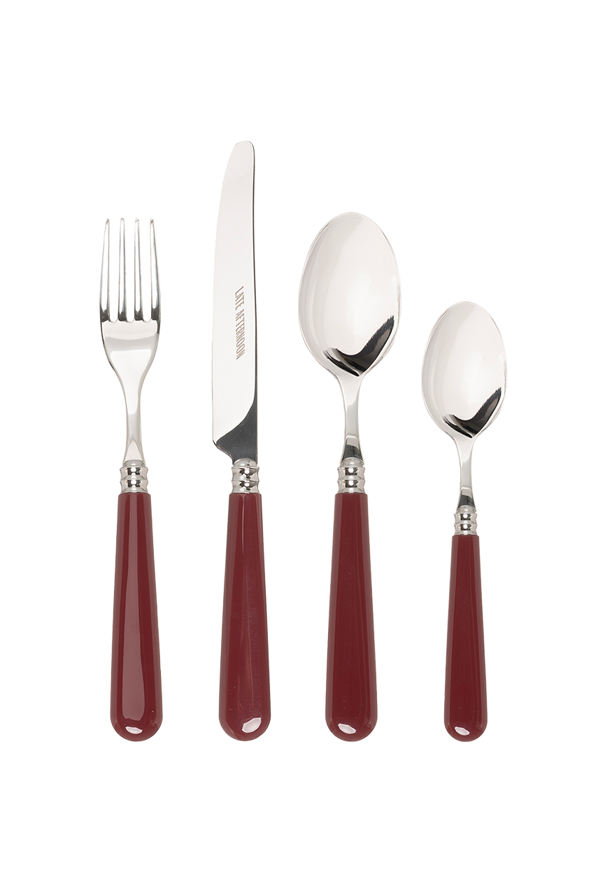 A colourful 16-piece set stainless steel cutlery set with a burgundy handle.