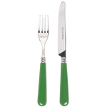 A colourful knife and fork stainless steel cutlery set with a green handle.