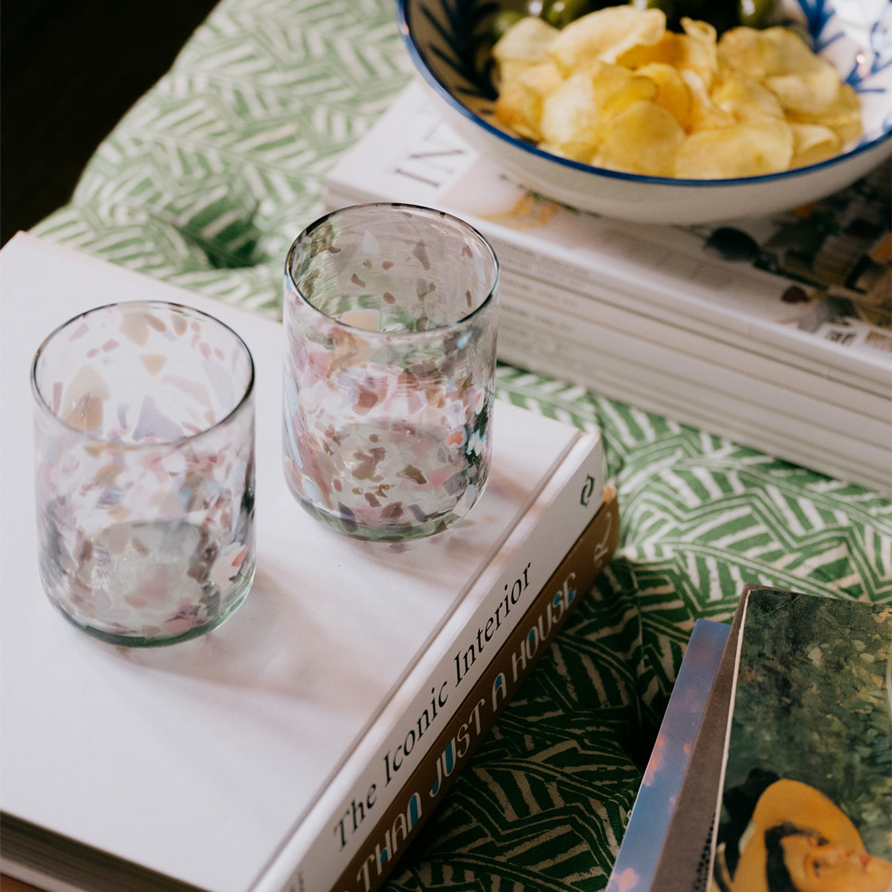 Dreamy drinking glasses and glass jugs made by hand in stunning colours. Classic cocktail tumblers and unique glass jugs, handmade by glassblowers in the Balearic Islands.