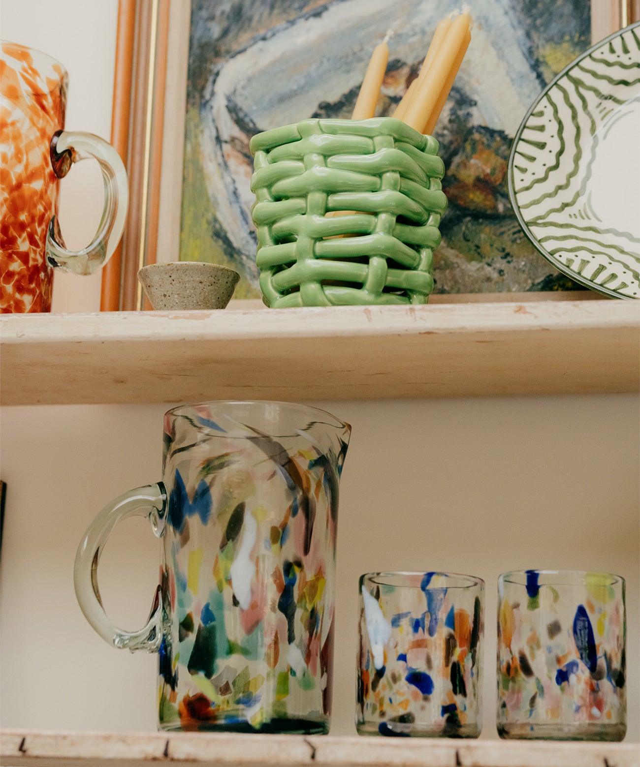 Dreamy drinking glasses and glass jugs made by hand in stunning colours. Classic cocktail tumblers and unique glass jugs, handmade by glassblowers in the Balearic Islands.