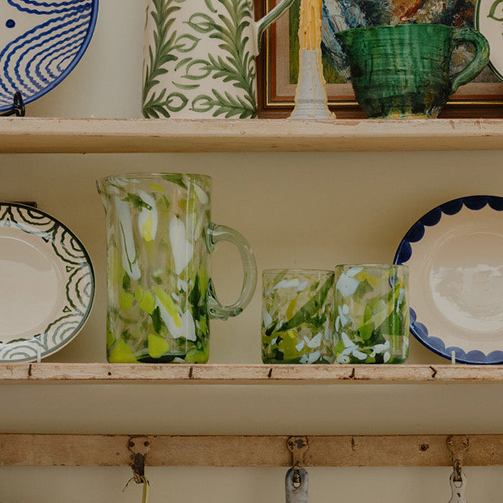Mouth-blown green terrazzo tumblers from the beautiful Balearic Islands.