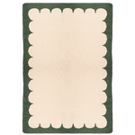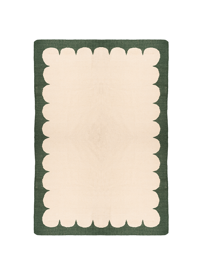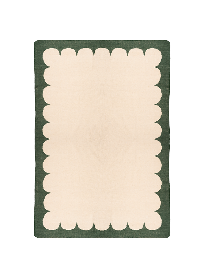 Handmade flat-weave wool rug with green scallop border.