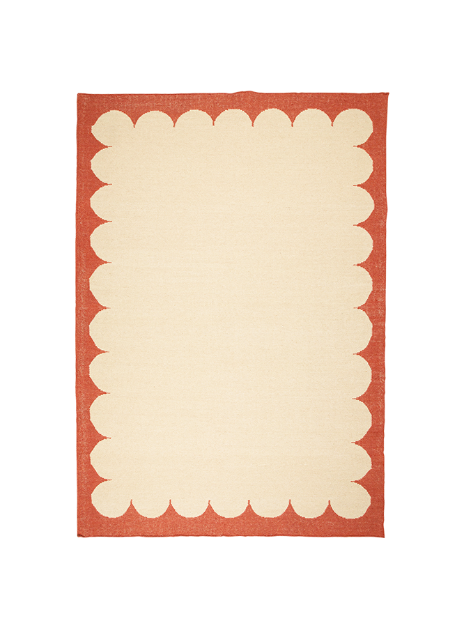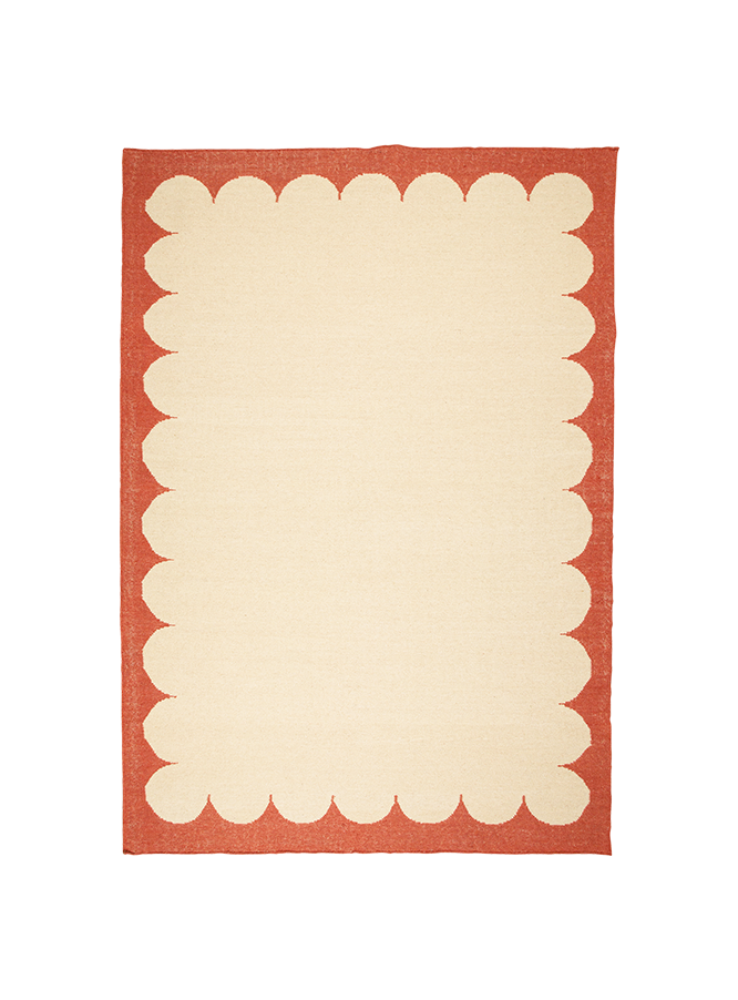 Handmade flat-weave wool rug with rust terracotta scallop border.