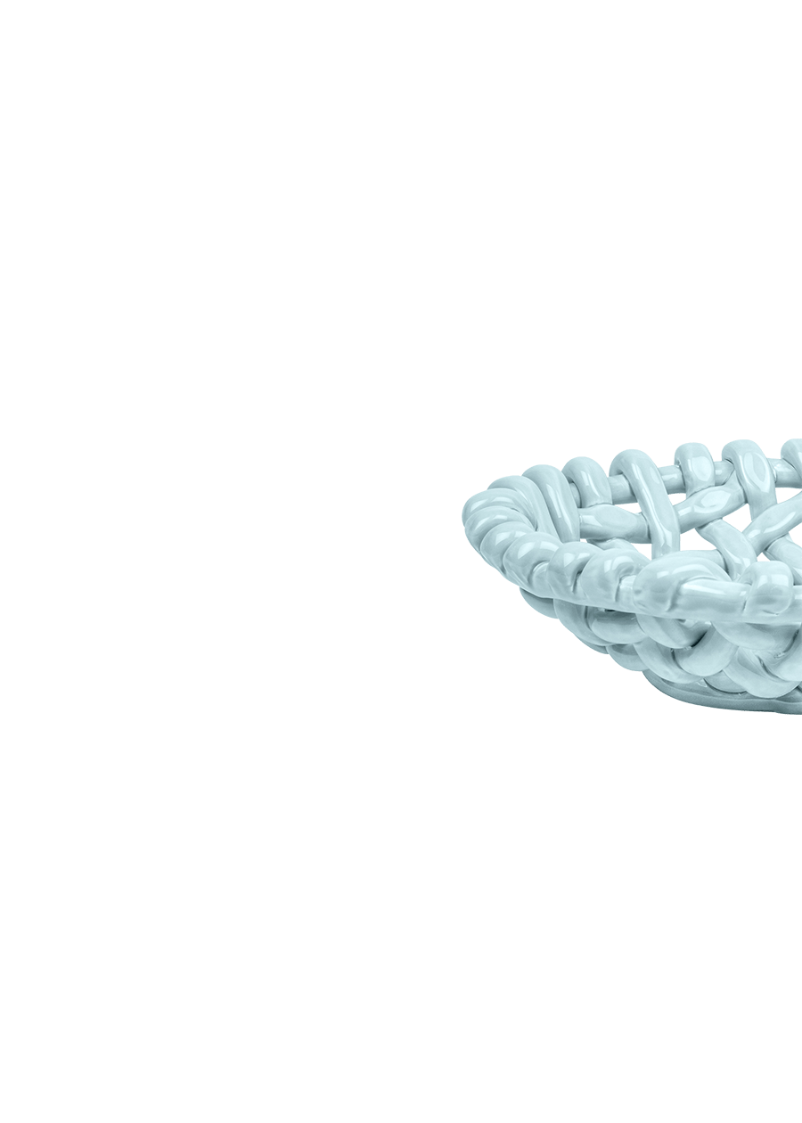 Handwoven sky blue ceramic basketweave bowl. Designed to display, these glazed bowls are the ultimate sideboard show-off.