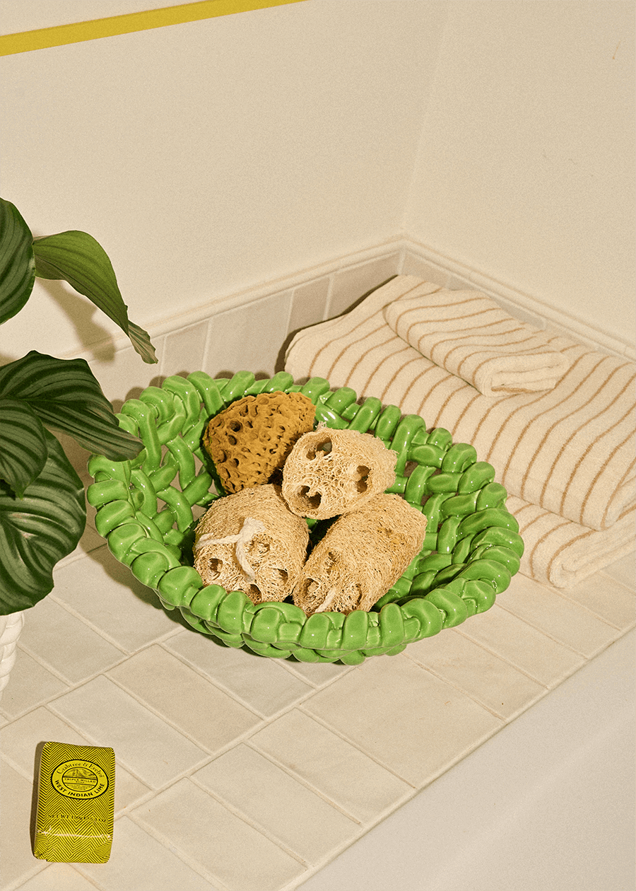 The Juicy Basketweave Collection is handwoven in Portugal using strips of clay by a highly skilled clay weaver.